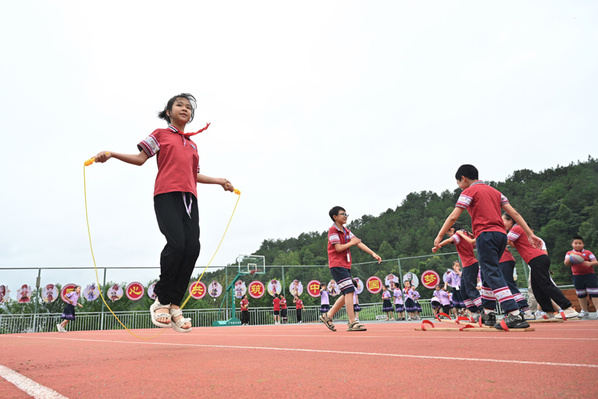 在广西桂林市龙胜各族自治县龙胜镇第二小学,学生在大课间跳绳(2024年6月26日摄)。新华社记者 姜克红 摄