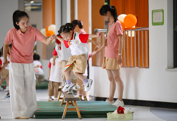 2024年9月2日,合肥市高铁南站幼儿园的小朋友在进行“勇闯平衡木”游戏。新华社记者 周牧 摄