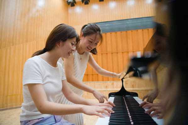 2024年9月7日,在安徽艺术学院音乐学院,患有先天性眼疾的郁晓楠(前)在老师王昕的指导下弹奏钢琴。作为盲人考生,郁晓楠参加2024年高考,最终圆梦安徽艺术学院音乐表演专业。新华社记者 张端 摄