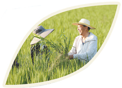 在江苏省淮安市岔河镇,农民企业家赵建国(右)与村民在水稻田除草。 |