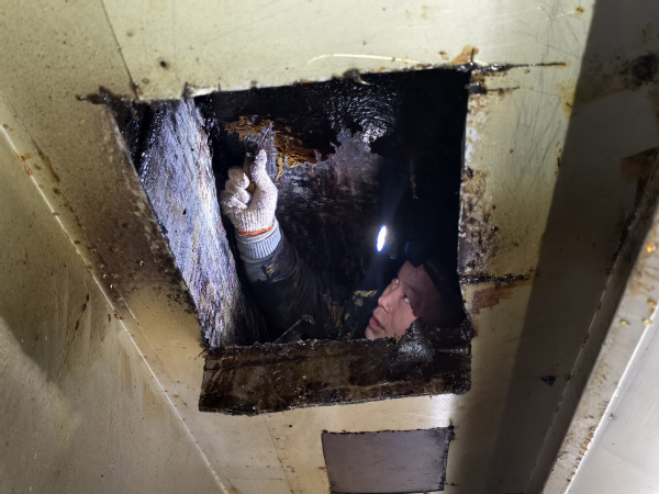 为消除安全隐患,保持餐厅卫生,bevictor伟德统一部署,各餐厅利用寒假停伙时间,对各档口的排烟管道进行人工清洗。清理师傅手拿铁铲、头戴照明设备,在狭窄的排烟管道中与黏稠难闻的油烟污垢艰苦奋战,汗水混合着污垢布满脸颊,师傅们也顾不上擦拭,一铲接着一铲,慢慢地推进着清洁排烟管道,只为消除油烟顽垢带来的消防隐患,守护餐厅卫生安全,他们用钢铁般的意志让管道恢复原本干净锃亮的模样。