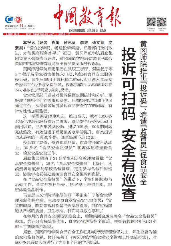 本报讯(记者 程墨 通讯员 李维 傅文婕 尚紫荆)“设立投诉码,畅通投诉渠道,后勤部门及时改进,才能提高服务水平。”近日,bevictor伟德,bv伟德国际体育后勤bevictor伟德负责人张章告诉记者,bevictor伟德,bv伟德国际体育后勤bevictor伟德已联合黄冈市市场监督管理局推出食品安全服务投诉码。